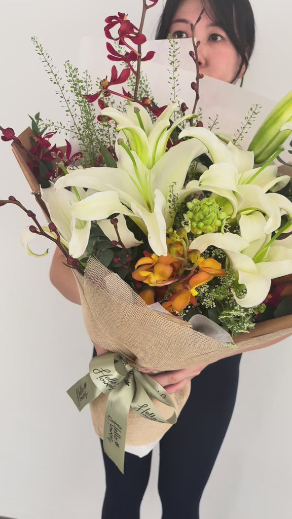 A bouquet designed to leave a lasting impression. At its core are white lilies, blooming with timeless elegance and symbolising purity, hope, and devotion. They are paired with orange orchids, glowing with warmth and vibrance to represent joy, resilience, and new beginnings. To complete the arrangement, deep red orchids add richness and depth, embodying admiration, passion, and strength. Lush greenery surrounds the blooms, giving the bouquet fullness and a sense of natural balance.